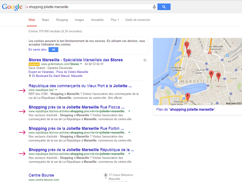 - “shopping joliette marseille” : 379 000 résultats → 4 premières places pour Republique.biz devant le Centre Bourse, Boutique OM, les Docks, Le Petit Futé, Office de Tourisme de Marseille…
